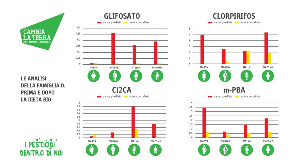 Dopo soli 15 giorni, i dati riportano nei valori urinari un abbattimento impressionante su insetticidi e glifosato (elemento oggi in evidenza dopo lo sciagurato rinnovo nel permesso di utilizzo).